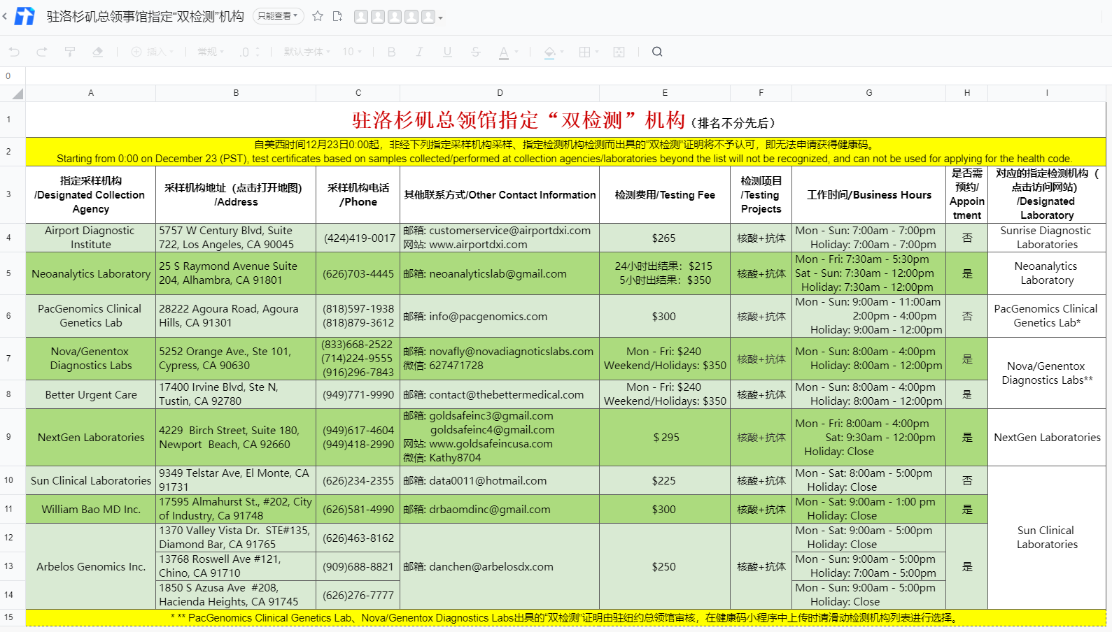 新政策:美西时间12 月23 日0 时起,核酸检测报告除须明示核酸(NAAT)、rt-PCR等字样外,还须明示具体的采样方式,包括