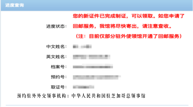 (5)“您的新证件已完成制证,可以领取。如您申请了回邮服务,我馆将尽快寄出,请注意查收”。此结果对应我馆已完成所有制证流程,将您的新证件和您提供的有关旧证件原件一并寄回的状态。与此同时,您的申请邮箱也将收到系统自动发送的有关制证完成的邮件。您可以开始通过查询回邮信封的邮寄跟踪号跟进邮寄进展。请不要到馆来领取。