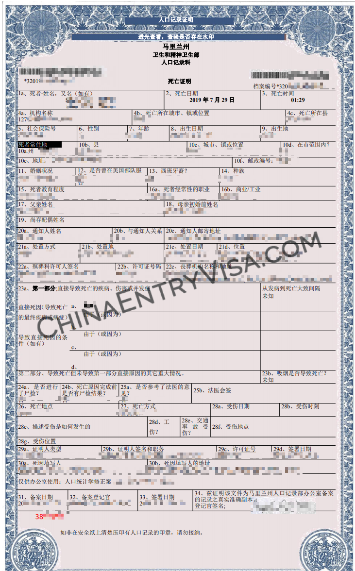 4. 对美国死亡证明进行中国驻美使领事馆认证。(可代办)