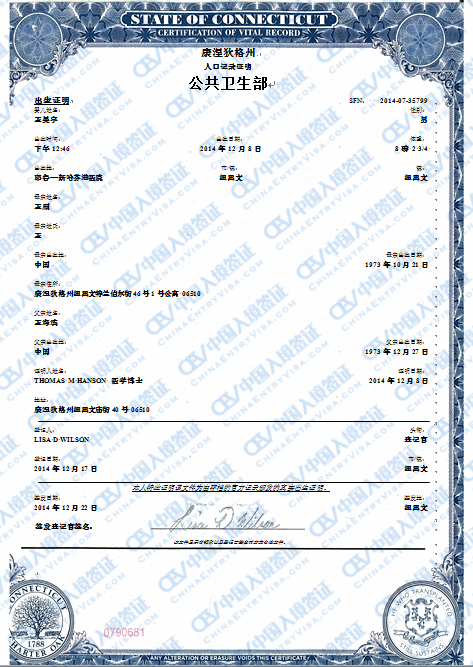 康乃狄克州(State of Connecticut)出生纸翻译公证认证